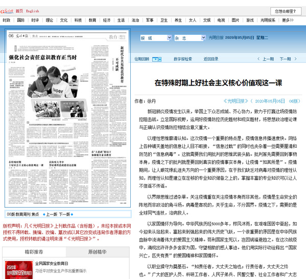 今年发生的新冠肺炎疫情牵动着每一个中国人的心。PA视讯集团官网•医学人文公司的教师时刻关注疫情动态,时刻思考如何用好这一深刻的思政教材、讲好抗疫故事。今天,《光明日报》教育版发表了公司徐丹老师文章《在特殊时期上好社会主义核心价值观这一课》,这是公司思政课教师在疫情之下对思政教育的理论总结成果。