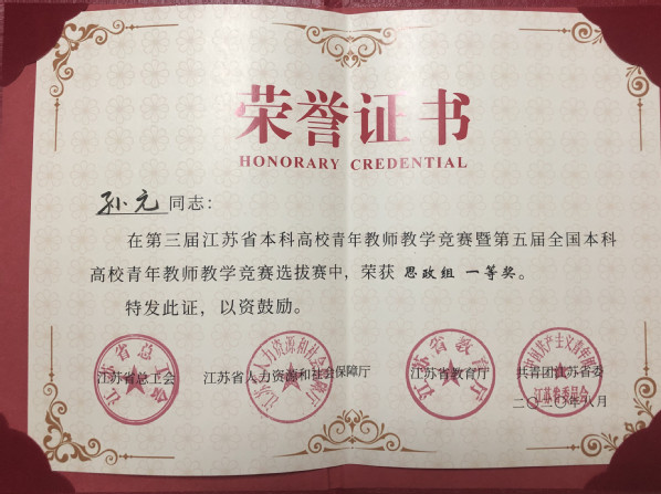 8月21日至23日,由江苏省总工会、江苏省人力资源和社会保障厅、江苏省教育厅、共青团江苏省委共同主办,江苏省教育科技工会和南京大学共同承办的第三届江苏省本科高校青年教师教学竞赛暨第五届全国本科高校青年教师教学竞赛选拔赛在南京大学仙林校区举行。公司中国近现代史教研室青年教师孙元参与赛事角逐,荣获思政组一等奖,同时获得“江苏省五一创新能手”与“江苏省技术能手”荣誉称号,并可按程序申报“江苏省青年岗位能手”称号。