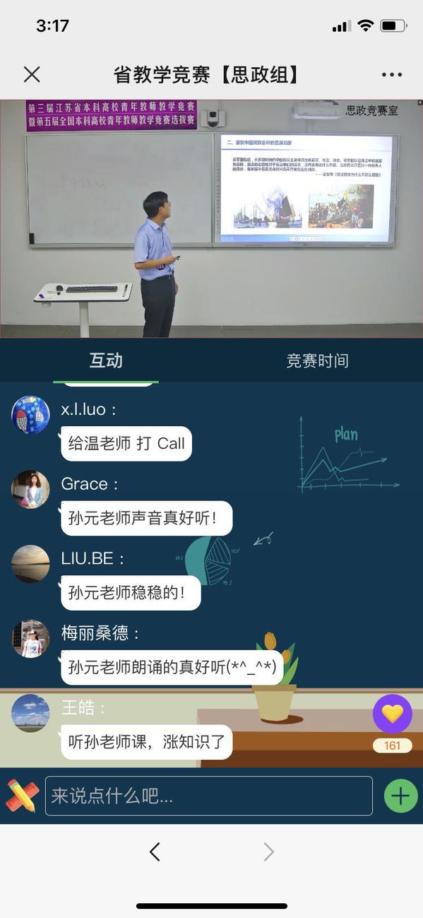 整个竞赛过程中,公司十分关心选手的参赛情况,并与校工会、校教务处通力协作,超前谋划,科学备赛,着力做好选手能力提升和后勤保障工作。暑假期间,公司副经理张艳萍,中国近现代史教研室主任王曼,第二届江苏省本科高校青年教师教学竞赛一等奖获得者、马克思主义原理教研室教师徐丹等教学名师结合竞赛规则,围绕如何完善教学设计、夯实教学基本功、提升教学有效性等方面对参赛选手进行深入指导。比赛前,张艳萍、王曼等老师前往现场为选手送行;赛事中,公司领导和老师一直关注比赛进程,并在“云端”给选手加油鼓劲。