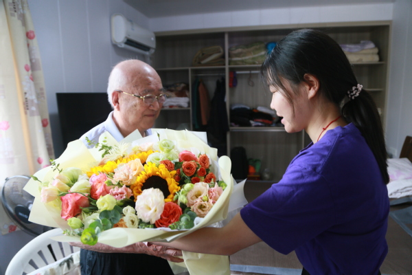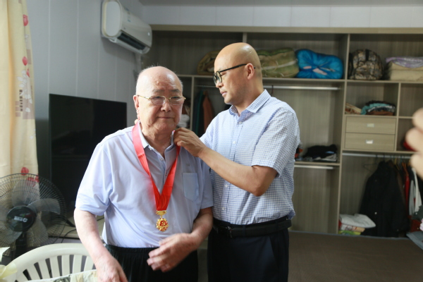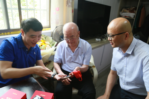张宗明向伊力老经理转达了公司师生对他的关怀与问候,并仔细帮老经理将纪念章佩戴于胸前。年近百岁、已有75年党龄的伊力老经理认真端详着纪念徽章:“有生之年能看到我们党迎来建党百年,我打心底高兴!”“希望我们全体共产党员不忘初心,牢记使命勇攀高峰,永葆青春!”情绪高昂而又铿锵有力,表达了一位老党员、老革命对党的一腔赤诚与不老初心。
