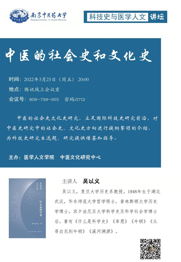 2022年3月25日晚上20点,由PA视讯中医文化研究中心主办的“科技史与医学人文”讲坛第一讲,在腾讯会议室顺利举行。复旦大学历史系吴以义教授应邀做了题为《中医的社会史和文化史》的专题讲座,全网在线聆听报告的人数高达350余人,此次讲座由中医文化研究中心刘振副教授主持。
