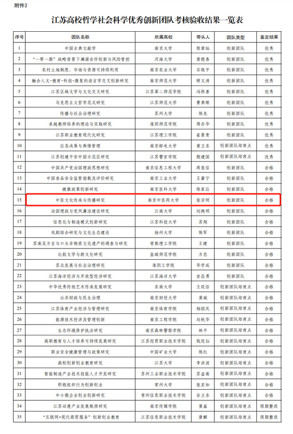 近期,省教育厅对2017年立项建设的江苏高校人文社会科公司外研究基地和优秀创新团队组织了考核验收。经材料审核、专家评议,包括我校“中医文化传承与传播研究”团队在内的22个创新团队验收结果为“合格”。