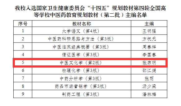 近日,国家卫生健康委员会公布“十四五”规划教材(第二批)申报结果。公司张宗明教授入选国家卫生健康委员会“十四五”规划教材第四轮规划教材《中医文化学(第2版)》主编。