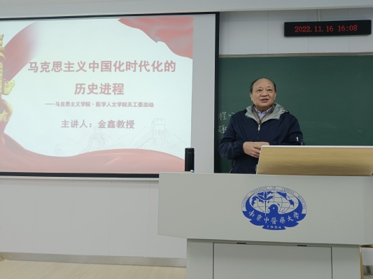 金鑫教授首先以习近平总书记在庆祝中国共产党成立100周年大会上的重要讲话中指出的“中国共产党为什么能,中国特色社会主义为什么好,归根到底是因为马克思主义行”这个理论问题开启了本次讲座。接下来,金教授带领全体师生回顾了马克思主义中国化百年发展的历史历程,重点讲述了马克思主义中国化历史进程中产生的几大重要理论成果:毛泽东思想、邓小平理论、“三个代表”重要思想、科学发展观、习近平新时代中国特色社会主义思想。金教授在讲座中指出党的奋斗历史,就是不断推进马克思主义中国化的历史,就是不断推进理论创新、进行理论创造的理论探索史,党带领人民创造的辉煌成就与马克思主义中国化百年发展的艰辛探索并取得一系列重大成果是密不可分的。在全国上下学习宣传党的二十大精神之际,在讲座的最后金教授勉励全体青年师生一定要带着感情学习二十大精神、一定要原原本本、逐字逐句学习党的二十大报告和党章,一定要好好掌握马克思主义哲学这一科学的世界观方法论。