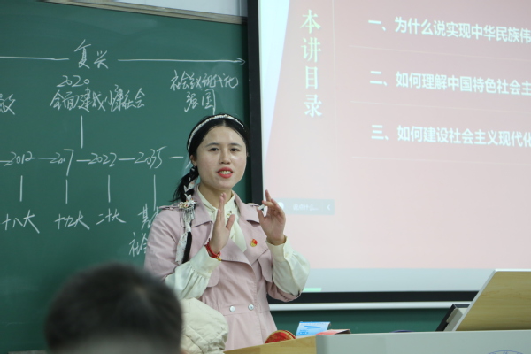 罗馨老师以《为什么说实现中华民族伟大复兴进入了不可逆转的历史进程》为主题,聚焦中华民族站起来、富起来、强起来的伟大飞跃的历史进程,围绕中国古代历史的辉煌、中国近代的屈辱悲歌、党的百年奋斗史等内容,综合运用案例、视频、互动问答等教学方法,结合传统文化的特有要素和中医药的独特魅力进行讲解,激发同学们浓厚的家国情怀。