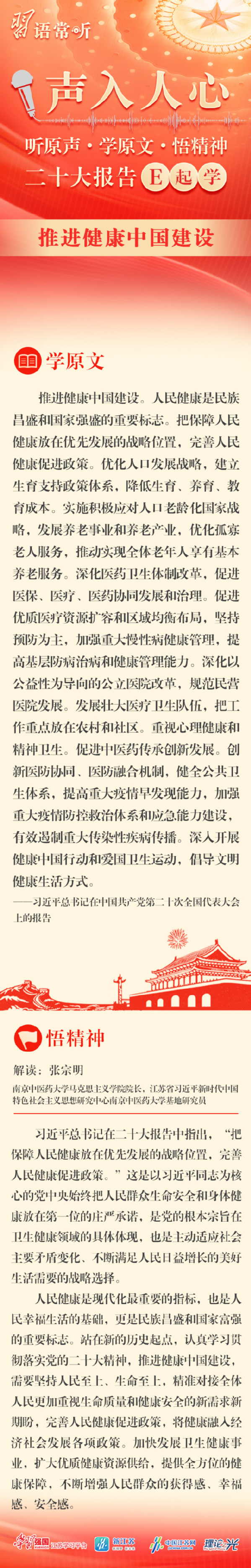 为深入学习宣传贯彻党的二十大精神,更好推动党的二十大精神入脑入心、家喻户晓,中国江苏网品牌栏目《习语常听》特别策划推出100期图文音频融媒产品《声入人心》,与大家一起学习领悟党的二十大报告的丰富内涵和精神实质。近日,由公司经理张宗明教授解读习近平总书记在中国共产党第二十次全国代表大会上有关“推进健康中国建设”的报告内容。