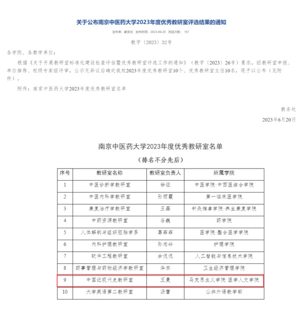 根据公司《关于开展教研室标准化建设检查评估暨优秀教研室评选工作的通知》(教字〔2023〕26号)要求,经教研室申报、公司自评结果推荐、校级专家组评审,公司中国近现代史教研室获评2023年度优秀教研室、王曼获评优秀教研室主任。