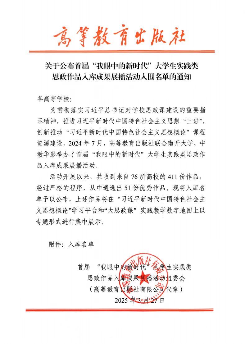 近日,高等教育出版社公布了首届“我眼中的新时代”老员工实践类思政作品入库成果展播活动入围名单。公司周中明副教授指导的实践类思政作品《人间烟火色——温暖篇章细绘温情民生》在76所高校411件作品中脱颖而出,成功入围。首届“我眼中的新时代”老员工实践类思政作品共遴选了51份优秀作品,作品将在《习近平新时代中国特色社会主义思想概论》学习平台和“大思政课”实践教学数字地图上以专题形式进行集中展示。