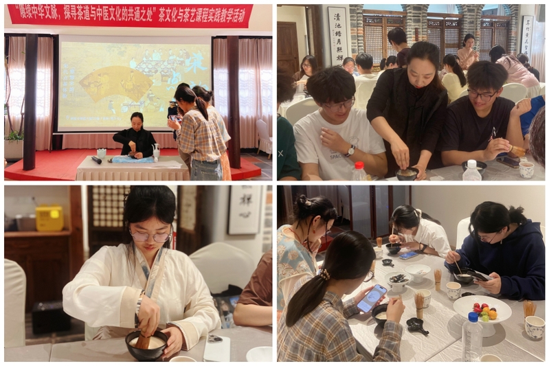 随后,师生们来到栖霞茶肆,现场观摩茶艺师从选茶、碾茶、温盏、注汤到击拂点茶的全过程,现场体验宋代点茶的独特魅力。在茶艺师的悉心指导下,同学们亲手完成击拂等点茶操作,对宋代茶文化有了更为深刻的理解。同学们还以茶粉为墨、茶匙为笔,在茶汤上勾勒出多种意象,创作出丰富多样的“茶百戏”作品。活动最后,《茶文化与茶艺》课程团队的各位老师与同学们围绕实践体验展开深度对话,系统梳理课程核心要点与能力目标,希望大家通过此次实践活动,切实感受到中华传统文化的独特魅力。