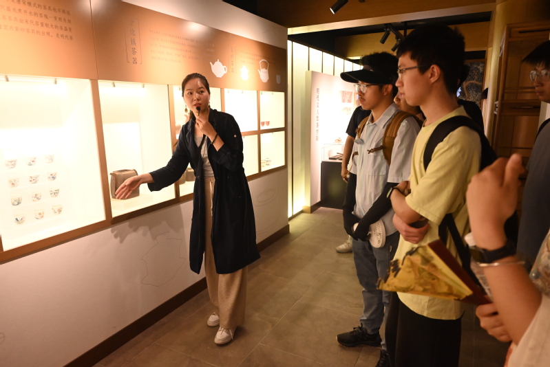 师生一行首先参观栖霞山陆羽茶庄,系统了解“茶圣”陆羽与栖霞山的历史渊源,对茶文化的历史脉络有了更为清晰的认识。从历代制茶技艺的演变中,现场师生深刻体悟到中华茶道“器以载道”的美学思想与“精行俭德”的文化内核,感受到茶文化深厚的历史底蕴和独特的文化魅力。