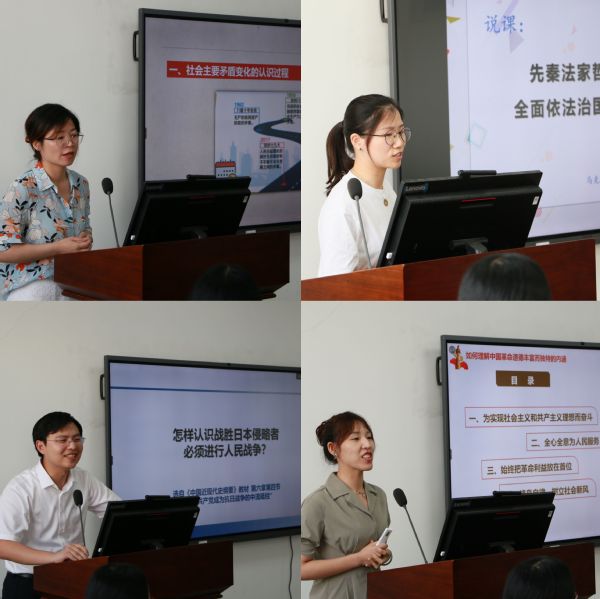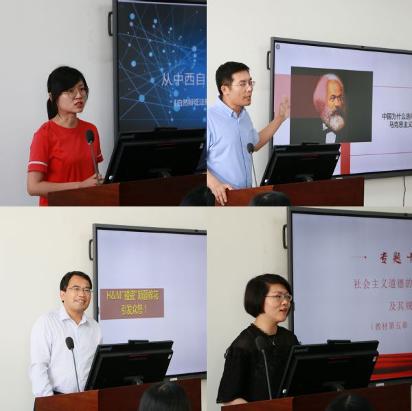 此次教学展示由近期全省高校思政课教学展示、江苏省研究生思政课教学竞赛和校青年教师教学竞赛等获奖的八名教师代表参与。宗刚等老师聚焦中国为什么选择了马克思主义、中国共产党在抗战中的中流砥柱作用、中国革命道德的内涵、人民在抗日战争中的主体地位、我国社会主要矛盾的变化、当前国际形势下的伟大斗争等内容,展示了党史融入思政课程的精彩示范教学;邹苏等老师围绕“社会主义道德的核心、原则及其规范”和“先秦法家哲学对全面依法治国的意义”做了党史融入思政课程和课程思政的说课分享。