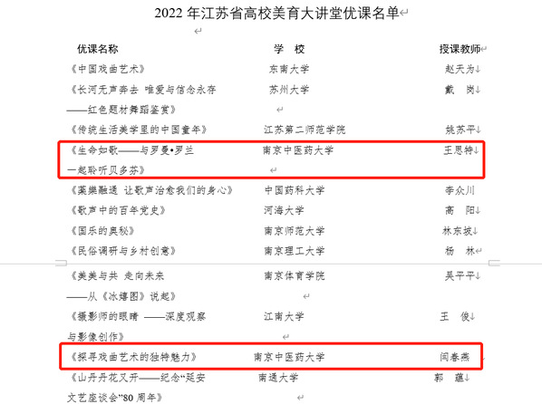 近日,省教育厅公布了2022年江苏省高校美育大讲堂优课评选复评结果, 我院王思特、闫春燕老师申报的美育课程《生命如歌——与罗曼•罗兰一起聆听贝多芬》和《探寻戏曲艺术的独特魅力》,双双入选“江苏省高校美育大讲堂优课”。